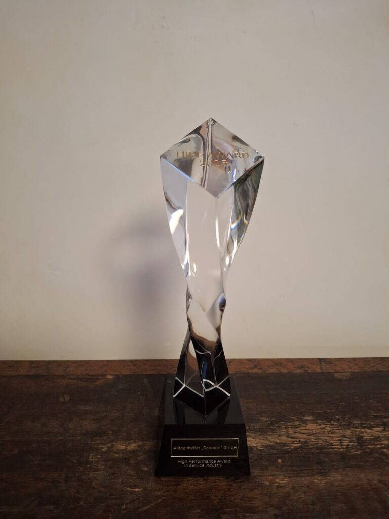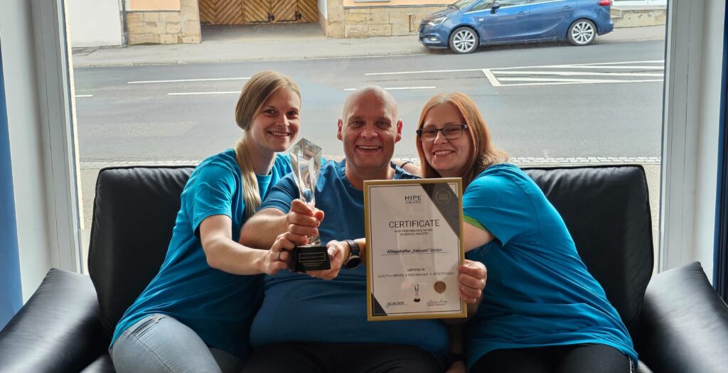 Im April 2025 wurde die SM Ihre Haushaltshilfe mit Herz mit dem HIPE AWARD für herausragende Servicequalität ausgezeichnet. Die Geschäftsführung – Stephanie Müller, Rainer Müller und Birgit Möllenberg – freut sich über die Anerkennung.